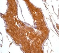 B. Immunohistochemical analysis of paraffin-embedded human testis using anti-PKA RabMAb (Cat. AMR09299G). |