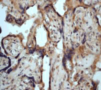 B. Immunohistochemical analysis of paraffin-embedded human placenta using anti-Phospho-PKC mu/PKD (p916) RabMAb (Cat. AMR09303G). |