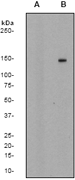 A. Western blot analysis on Raji cell lysates using anti-Phospho- PLC?II (pY1217) RabMAb (Cat. AMR09338G). Cells were either (A) untreated (B) treated with pervanadate.