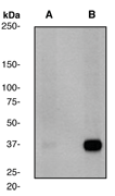 A. Western blot analysis on Hela cell lysates using anti-Phospho-PP1 alpha (pT320) RabMAb (Cat. AMR09424G). Cells were either (A) untreated or (B) treated with Calyculin A.