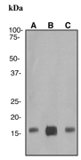 A.Western blot analysis on (A) human heart, (B) human placenta and (C) human brain lysates using anti-PrealbuminRabMAb (Cat. APR12961G), dilution 1:5000.