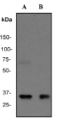 A. Western blot analysis on (A) Jurkat and (B) HEK293 cell lysates using anti-Presenilin-1 RabMAb (Cat. AMR09509G), 1:2000 dilution. |