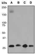 A. Western blot analysis on (A) MCF-7, (B) PC-12 (C) A431 and (D) Ramos cell lysate using anti-prohibitin RabMAb (Cat. AMR09556G), dilution 1:1000.
