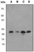 A.Western blot analysis on (A) HeLa, (B) human spleen, (C) Jurkat and (D) HepG2 cell lysates using anti-Prostaglandin E Synthase 3 RabMAb (Cat. AMR09561G).