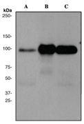 A. Western blot analysis on (A) human brain, (B) mouse brain, (C) rat brain tissue lysates using anti-PSD95 RabMAb (Cat. APR12998G), dilution 1:2000. |