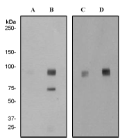 A. Western blot analysis on (A, B) human brain tissue lysate and rat brain lysate (C, D) using anti-phospho PSD95 (pS295) RabMAb (Cat. APR12999G), 1:20,000 dilution. Cells were either (A, C) treated (B, D) untreated with LP |