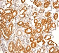 B. Immunohistochemical analysis of paraffin-embedded human kidney using anti-CaMK1 RabMAb (Cat. AMM05683G). |