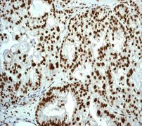 B. Immunohistochemical analysis of paraffin-embedded human breast carcinoma using anti-CDK9 RabMAb (Cat. AMM05360G). |