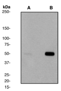A. Western blot analysis on Hela cell lysates using anti-Phospho-PTP1B (pS352) RabMAb (Cat. AMR09649G), 1:5000 dilution. Cells were either (A) untreated or (B) treated with Calyculin A. |