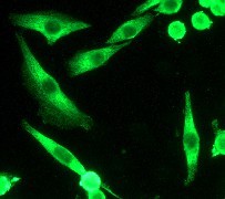 B. Immunofluorescent staining of HeLa cells using anti-PUMA (C-term) RabMAb (Cat. APR07167G).