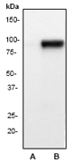 A. Western blot analysis of A431 using anti-RSK-1 (pS380) RabMAb (Cat. AMM07677G), dilution 1:10,000. A431 cells were either untreated (A) or treated with EGF (B)