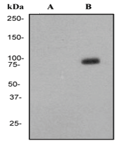 A. Western blot analysis on Hela cell lysate using anti-RSK4 Phospho (pS235) RabMAb (Cat. AMM07686G), dilution 1:10,000. Cells were either (A) untreated or (B) treated with Calyculin A.