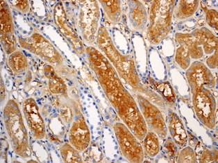 Immunohistochemical analysis of paraffin-embedded normal kidney tissue using anti-SAA4 RabMAb (Cat. AMR09806G). |