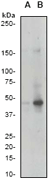 A. Western blot analysis on 3T3 cell lysates using anti-Phospho-MEKK4 (p80) RabMAb (Cat. AMM07753G), 1:5000 dilution. Cells were either (A) untreated (B) treated with PDGF