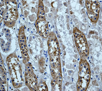 B. Immunohistochemical staining of paraffin-embedded human kidney using anti-SAP RabMAb (Cat. APR13293G). |