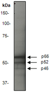 A synthetic peptide corresponding to residues in the SH2 domain of human SHC1 was used as immunogen. The antibody detects p46, p52 and p56