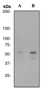 A.Western blot analysis on 293T cell lysates using anti-Phospho-SHC1 (pY239/240) RabMAb (Cat. APR13303G). Cells were either (A) untreated (B) treated with EGF |