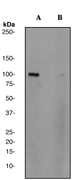 A. Western blot analysis on 293 cell lysates using anti-Phospho-Sir2/SIRT1 (pS47) RabMAb (Cat. APR09939G), 1:2000 dilution. Cells were either (A) untreated (B) treated with LP |