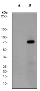 A. Western blot analysis on Jurkat cell lysates using anti-Phospho-SLP-76 (pY145) RabMAb (Cat. AMM07885G), 1:200,000 dilution. Cells were either (A) untreated (B) treated with pervanadate. |