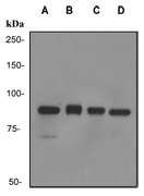Western blot analysis on (A) HeLa (B) 293 (C) NIH-3T3 (D) A431 cell lysates using anti-Stat-1 RabMAb (Cat. APR10254G). |
