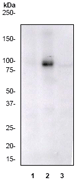 A. Western blot analysis on A431 cell lysate using anti- Phospho-Stat5 (Y694) RabMAb (Cat. APR10256G). Cell lysates were (1) untreated, (2) treated with EGF, or (3) treated with Phosphatase.