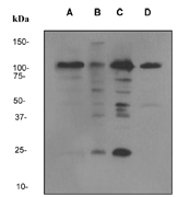 Western blot analysis on (A) HeLa (B) HL-60 (C) A431 and (D) NIH/3T3 cell lysates using anti-SUMO-1 RabMAb (Cat. APR10338G).