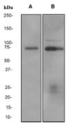 Western blot analysis on (a) 293T and (b) Jurkat cell lysates using anti-TorC3 RabMAb (Cat. AMM05439G).