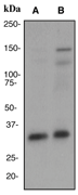 A.Western blot analysis on (A) SH-SY5Y and (B) 293T cell lysates using anti-TorsinA RabMAb (Cat. APR13775G), dilution 1:1000. |