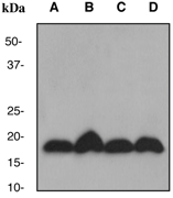 A. Western blot analysis on (A) U937, (B) HeLa, (C) Jurkat and (D) HUVEC cell lysates using anti-UBC9 RabMAb (Cat. APR10630G), dilution 1:10,000.