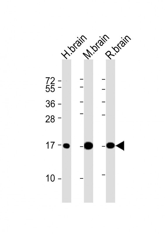 All lanes : Anti-MAP1LC3A Antibody at 1:2000 dilution Lane 1: human brain lysates Lane 2: mouse brain lysates Lane 3: rat brain lysates Lysates/proteins at 20 μg per lane. Secondary Goat Anti-mouse IgG, (H+L), Peroxidase conjugated at 1/10000 dilution. Predicted band size : 14 kDa Blocking/Dilution buffer: 5% NFDM/TBST.
