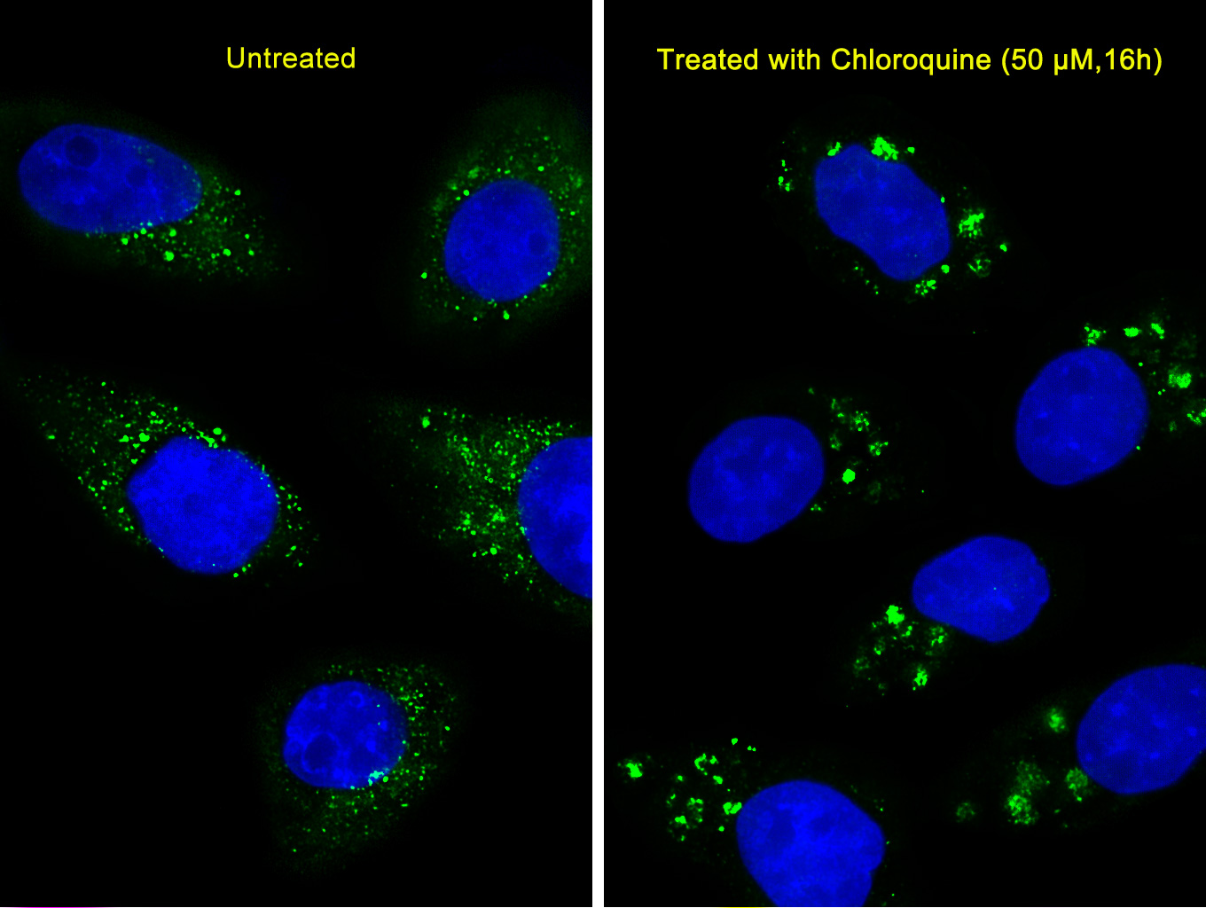 Immunofluorescent analysis of U251 cells, using LC3 Antibody (APG8) (Cat. AMM04366G). U251 cells(right) were treated with Chloroquine (50 μM,16h). AMM04366G was diluted at 1:25 dilution. Dylight Fluor 488-conjugated goat anti-mouse lgG at 1:400 dilution was used as the secondary antibody (green). DAPI was used to stain the cell nuclear (blue). |