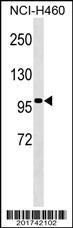 TLE4 Antibody (Center) (Cat. AMM08696G) western blot analysis in NCI-H460 cell line lysates (35μg/lane).This demonstrates the TLE4 antibody detected the TLE4 protein (arrow). |