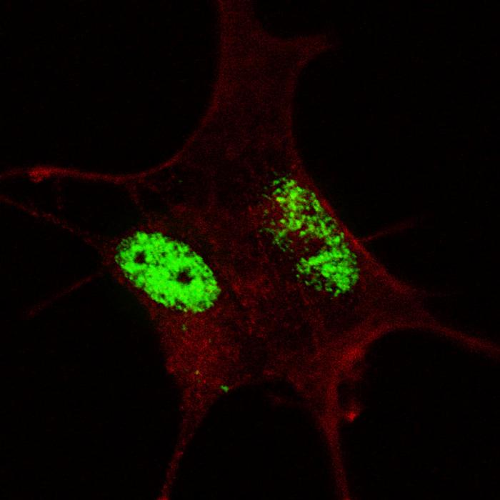 Fluorescent confocal image of an SY5Y cell stained with APR14253G SOX2 antibody. SY5Y cells were fixed with 4% PFA (20 min), permeabilized with Triton X-100 (0.2%, 30 min), then incubated with APR14253G SOX2 primary antibody (1:200, 2 h at room temperature). For secondary antibody, Alexa Fluor? 488 conjugated donkey anti-mouse antibody (green) was used (1:1000, 1h).Cytoplasmic actin was counterstained with Alexa Fluor? 555 (red) conjugated Phalloidin (5.25 μM, 25 min). Nuclei were counterstained with Hoechst 33342 (blue) (10 μg/ml, 3 min). SOX2 immunoreactivity is localized exclusively to the nucleus.