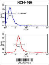 Flow cytometric analysis of NCI-H460 cells using SOX2 Monoclonal Antibody (ascites)(bottom histogram) compared to a negative control cell (top histogram). PE-conjugated goat-anti-mouse secondary antibodies were used for the analysis. |