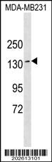 THBS1 Antibody (Center)(Cat. APR10934G) western blot analysis in MDA-MB231 cell line lysates (35μg/lane).This demonstrates the THBS1 antibody detected the THBS1 protein (arrow). |