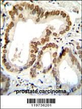 BTG2 Antibody (N-term) (Cat. APR14069G)immunohistochemistry analysis in formalin fixed and paraffin embedded human prostate carcinoma followed by peroxidase conjugation of the secondary antibody and DAB staining.This data demonstrates the use of BTG2 Antibody (N-term) for immunohistochemistry. Clinical relevance has not been evaluated. |