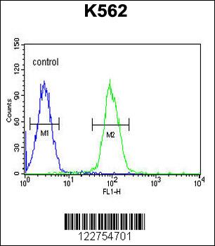 AKR1C3 Antibody (N-term) (Cat. APR10809G) flow cytometric analysis of K562 cells (right histogram) compared to a negative control cell (left histogram).FITC-conjugated goat-anti-rabbit secondary antibodies were used for the analysis. |