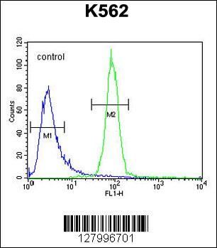 OR52A1 Antibody (C-term) (Cat. APR14208G) flow cytometric analysis of K562 cells (right histogram) compared to a negative control cell (left histogram).FITC-conjugated goat-anti-rabbit secondary antibodies were used for the analysis. |