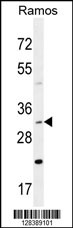 DNAJB13 Antibody (Center) (Cat. AMM08619G) western blot analysis in Ramos cell line lysates (35ug/lane).This demonstrates the DNAJB13 antibody detected the DNAJB13 protein (arrow).