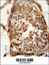 DNAJB13 antibody (Center) (Cat. AMM08619G) immunohistochemistry analysis in formalin fixed and paraffin embedded human testis carcinoma followed by peroxidase conjugation of the secondary antibody and DAB staining. This data demonstrates the use of the DNAJB13 antibody (Center) for immunohistochemistry. Clinical relevance has not been evaluated. |