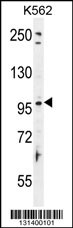 TAS1R2 Antibody (C-term) (Cat. APR14255G) western blot analysis in K562 cell line lysates (35ug/lane).This demonstrates the TAS1R2 antibody detected the TAS1R2 protein (arrow). |