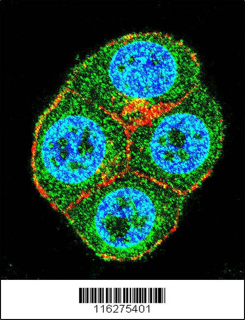 Confocal immunofluorescent analysis of BTRC Antibody (N-term)( APR11251G) with ZR-75-1 cell followed by Alexa Fluor 488-conjugated goat anti-rabbit lgG (green). Actin filaments have been labeled with Alexa Fluor 555 phalloidin (red).DAPI was used to stain the cell nuclear (blue). |