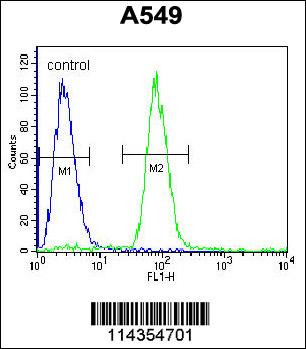 SOX3 Antibody (Center P204) (Cat. APR14260G) flow cytometric analysis of A549 cells (right histogram) compared to a negative control cell (left histogram).FITC-conjugated goat-anti-rabbit secondary antibodies were used for the analysis. |