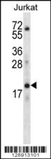 KRTAP13-3 Antibody (C-term) (Cat. AMM08640G) western blot analysis in Jurkat cell line lysates (35ug/lane).This demonstrates the KRTAP13-3 antibody detected the KRTAP13-3 protein (arrow).
