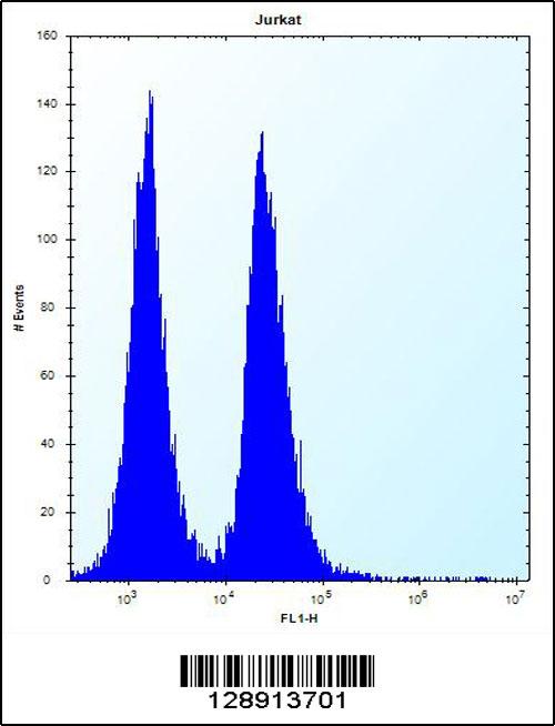 KRTAP13-3 Antibody (C-term) (Cat. AMM08640G) flow cytometric analysis of Jurkat cells (right histogram) compared to a negative control cell (left histogram).FITC-conjugated donkey-anti-rabbit secondary antibodies were used for the analysis. |