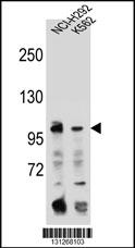TFR2 Antibody (C-term) (Cat. APR10931G) western blot analysis in NCI-H292,K562 cell line lysates (35ug/lane).This demonstrates the TFR2 antibody detected the TFR2 protein (arrow). |