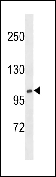 XYLT1 Antibody (N-term) (Cat. AMM08715G) western blot analysis in NCI-H460 cell line lysates (35ug/lane).This demonstrates the XYLT1 antibody detected the XYLT1 protein (arrow).