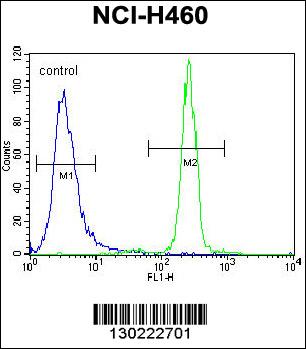 XYLT1 Antibody (N-term) (Cat. AMM08715G) flow cytometric analysis of NCI-H460 cells (right histogram) compared to a negative control cell (left histogram).FITC-conjugated goat-anti-rabbit secondary antibodies were used for the analysis. |