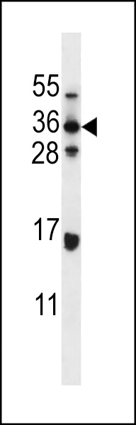ELOVL5 Antibody (C-term) (Cat. APR10870G) western blot analysis in MDA-MB435 cell line lysates (35ug/lane).This demonstrates the ELOVL5 antibody detected the ELOVL5 protein (arrow). |