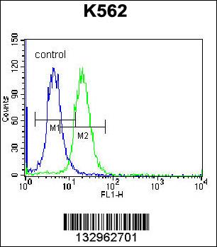 FSHB/FSH Antibody (Center) (Cat. APR10877G) flow cytometric analysis of K562 cells (right histogram) compared to a negative control cell (left histogram).FITC-conjugated donkey-anti-rabbit secondary antibodies were used for the analysis. |